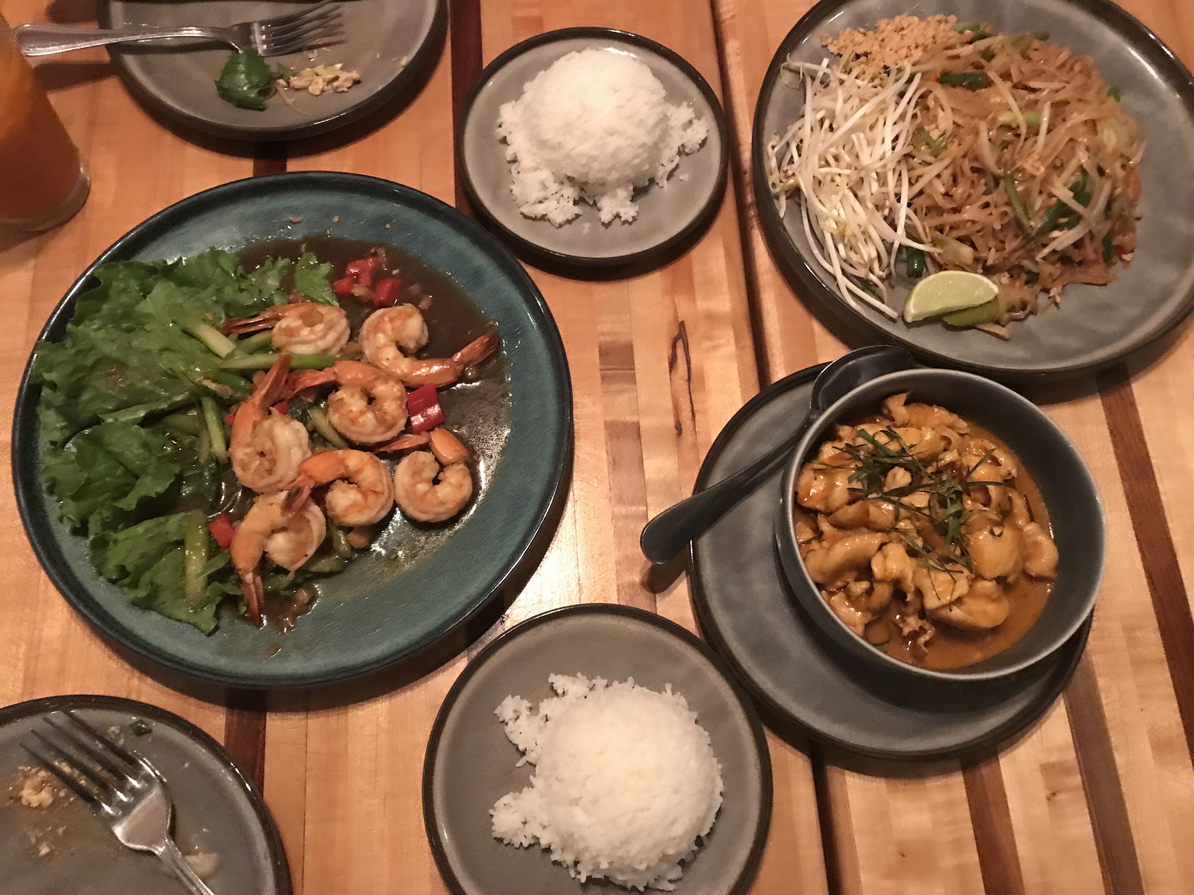 Started by Aschara Vigsittaboot, the sister of Taw Vigsittaboot of the now-closed, long-beloved Thai X-ing, with investor-partners Ralph Brabham and Drew Porterfield.  The dishes are a pretty familiar list of Thai favorites, built on family recipes and using fresh ingredients.   Easily spotted are pad Thai, larb gai, chicken satay, and massaman curry, along with dumplings, spring rolls, and noodle bowls.  The larb gai of warm chicken over greens has a background spice that builds as you feast.  Udom’s curry is a bit sweet with fruit (Tamarind? Tomato?) woven into the sauce. It is named after Vigsittaboot’s mother and derivative of panang curry.  The shrimp in garlic has big chunks of ginger in the mix.  In fact, while the flavors are often balanced, the kitchen seems to like having large pieces of vegetables or meats or other ingredients as a technique.  The house specialty chicken dish is a crisply fried assembly of meat pieces and green beans.