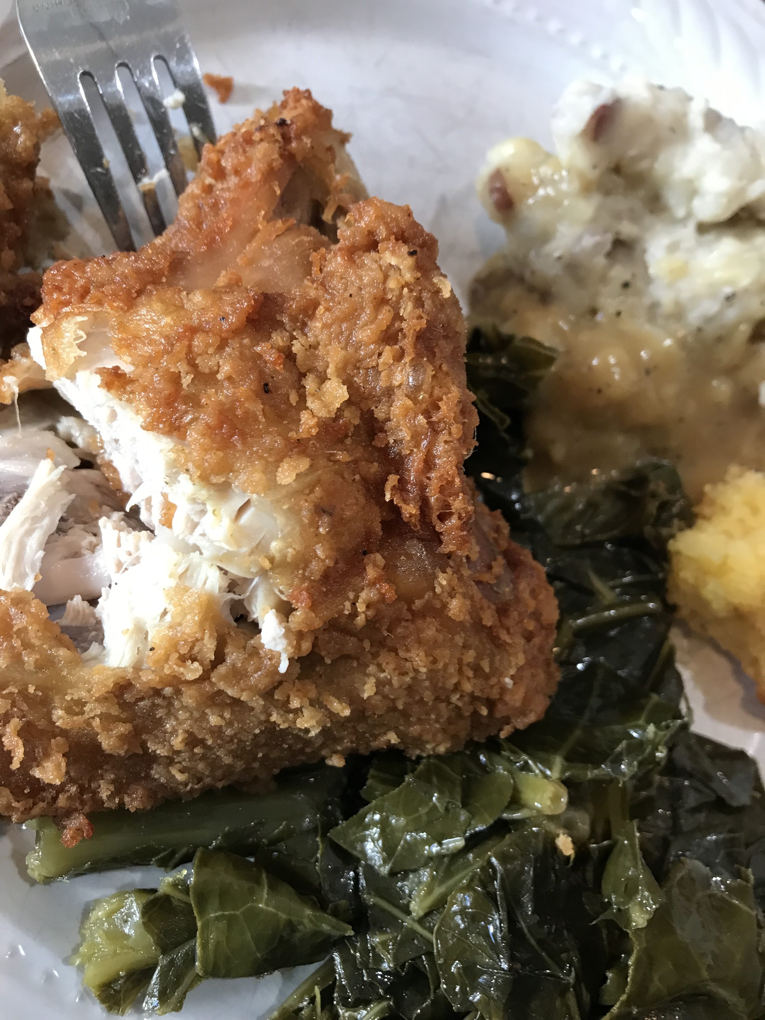 Image: Fried Chicken, Greens, Mashed Potatoes with Gravy and a hint of Cornbread.