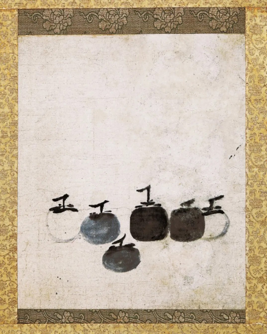 Six Persimmons along with a companion piece, Chestnuts, will be in San Francisco for a limited time, on loan from their home in Japan. The Times writes, “Painted with ink on paper in the 13th century, probably by a Chinese monk named Muqi, as part of a handscroll that also included “Chestnuts,” it was acquired in the 1500s by a Japanese merchant; cut out of the scroll and mounted on sumptuous green-and-white fabric inlaid with golden peonies; and donated to Daitokuji Ryokoin Temple, the Zen Buddhist institution in Kyoto that has been its guardian ever since, displaying it to the public only once a year for a single day.”